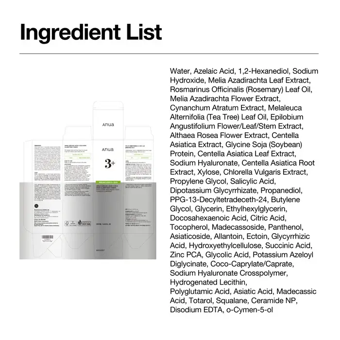 Clarifying toner with 3% Azelaic Acid and Cica to calm irritation, reduce redness, control oil, and improve overall skin clarity by Anua. 100% authentic product. Beware of imitations.
