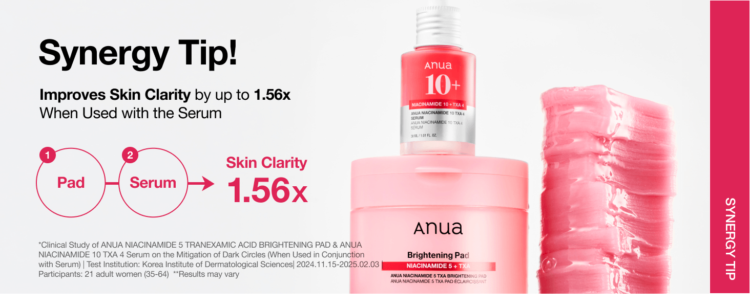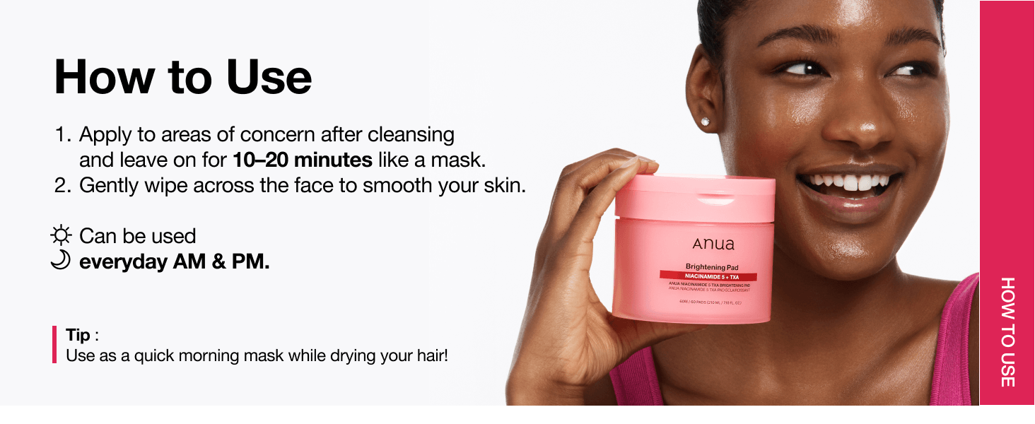 – Easy-to-use pads infused with the jey ingredients of ANUA Niacinamide TXA serum